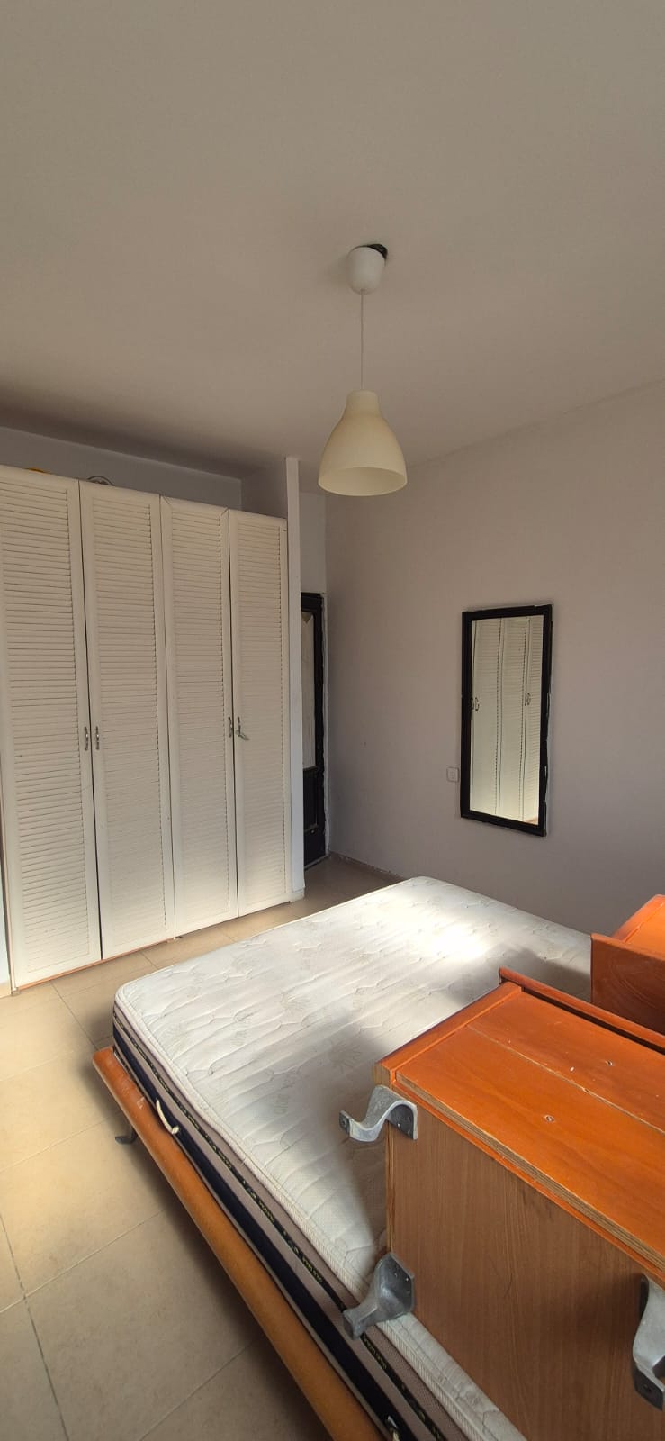בדירה יש מיטה, 2 שידות, מקרר, כיריים ותנור.